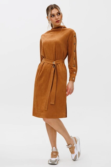 Платье прямого силуэта из трикотажной ткани средней плотности с велюровым эффектом. Горловина цельнокроеная стойка. В левом боковом шве внизу обработана шлица. Рукав втачной с планкой застежкой вдоль рукава и притачной манжетой с застежкой на петлю и пуговицу. К платью прилагается сьемный пояс из основной ткани с застежкой на петлю и пуговицу. Фурнитура может быть изменена с сохранением художественного образа. Длина платья в размерах 44,46,48-107 см, в 50 и 52-112см. +/-2 см. Длина рукава - 55 см.