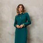 Платье свободного силуэта из трикотажной ткани с принтом. Рукав втачной одношовный со складками по низу и манжетой. В боковых швах карманы. Горловина обработана планкой в форме лодочки. По переду в в ерхней части настрочена сетка. Длина платья - 91 см , длина рукава платья - 53 см.