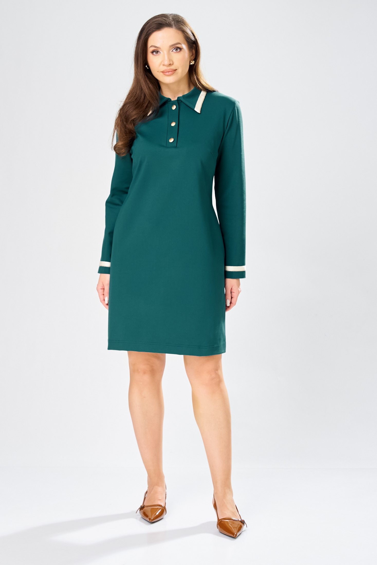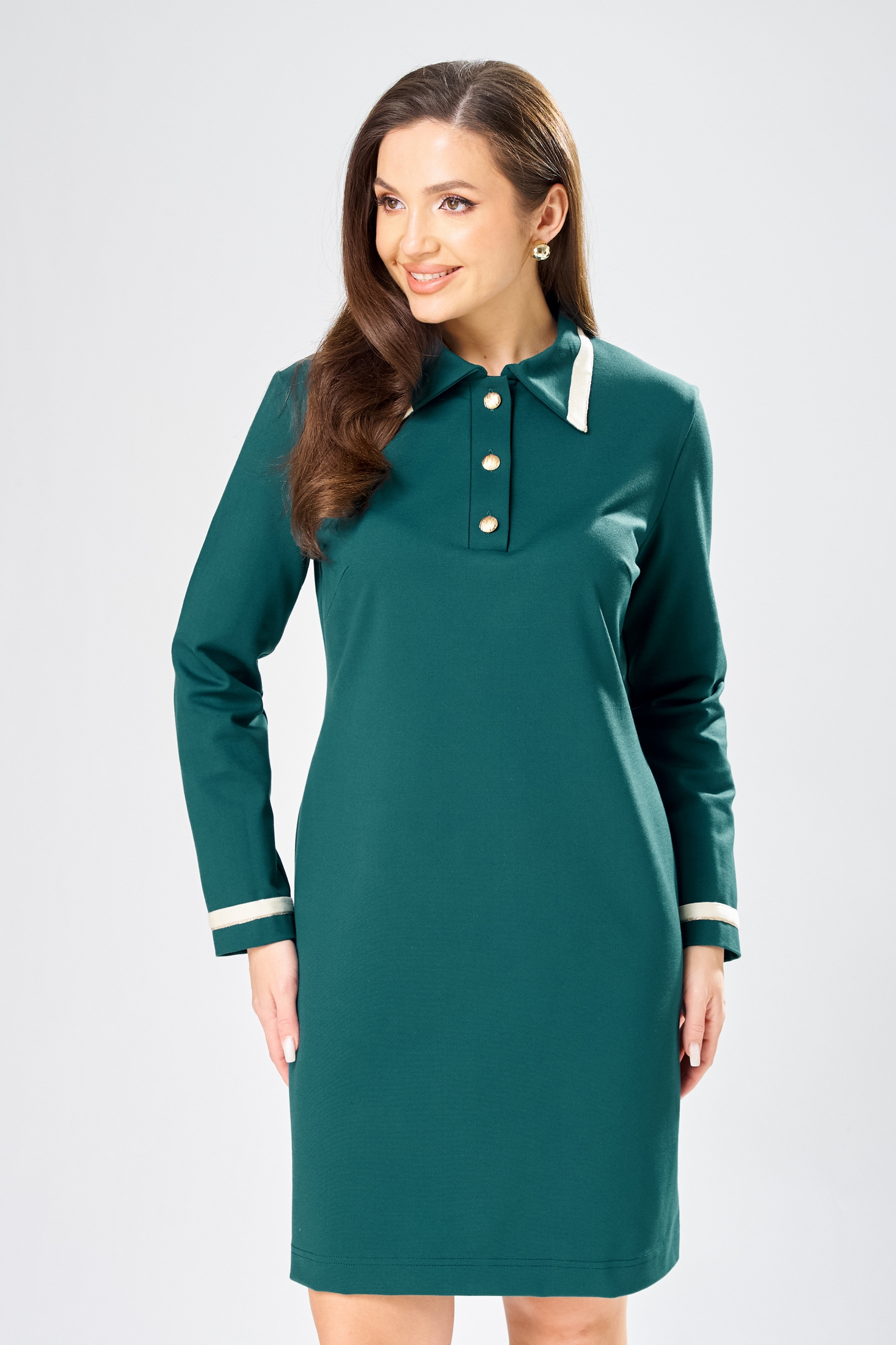 Платье слегка приталенного силуэта из плотного трикотажного полотна. Перед с застежкой поло и нагрудными вытачками. По воротнику и низу рукава настрочена декоративная тесьма. Длина платья 96 - см, длина рукава - 61 см.