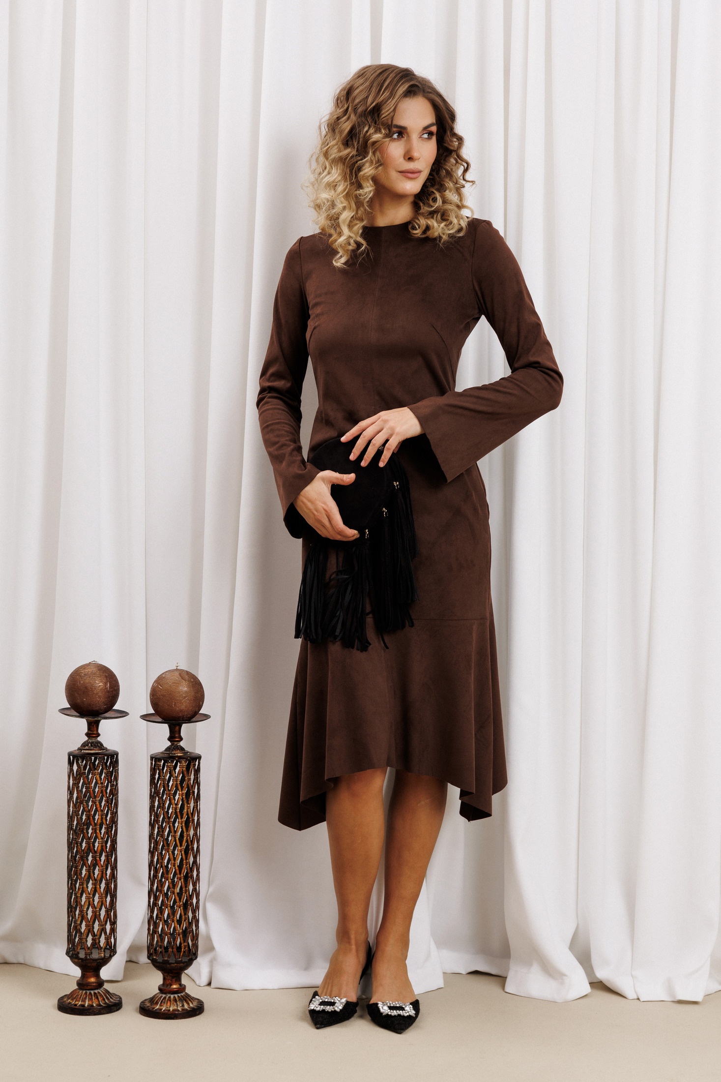 Платье приталенного силуэта отрезное по линии талии из мягкой замшевой ткани. Перед со средним швом и нагрудной вытачкой. Спинка с талиевыми вытачками, средним швом и потайной молнией. Рукав втачной слегка расширенный книзу. По низу изделия ассиметричный волан. Средний шов и шов вдоль талии отстрочен отделочной нитью. Длина платья по среднему шву сзади 103 см, по самым длинным концам - 115 см, длина рукава 62 см. Изделие подходит на рост 164-170