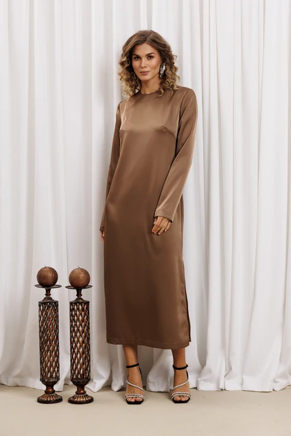 Платье прямого силуэта выполнено из атласной ткани. Перед с нагрудной вытачкой. Спинка с застежкой "капелькой" на петлю и пуговицу сверху. В боковом шве разрез. Рукав втачной одношовный. К платью прилагается пояс из основной ткани. Длина платья 125 см, длина рукава - 61 см. Изделие подходит на рост 164-170