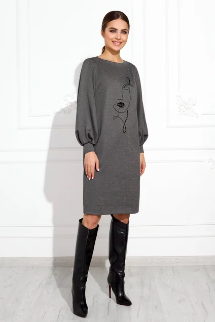 Платье прямого силуэта. Перед с нагрудными вытачками. Спинка со средним швом. Горловина лодочкой обработана планкой. Рукав одношовный втачной по низу со складками собранными на манжету-довяз. Украшением служит вышивка, расположенная по центру переда в районе груди. Длина платья: 99 см. Длина рукава: 60 см