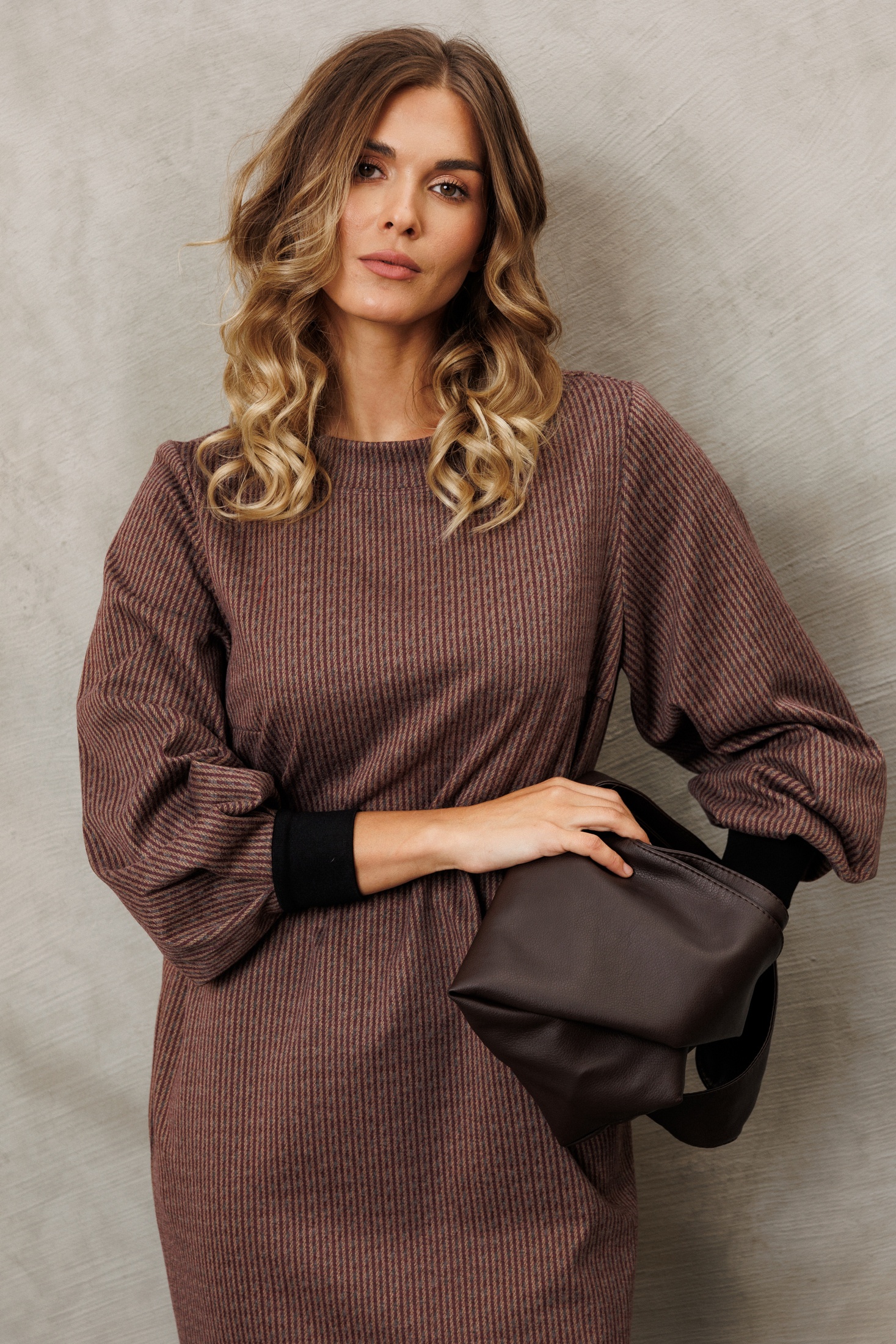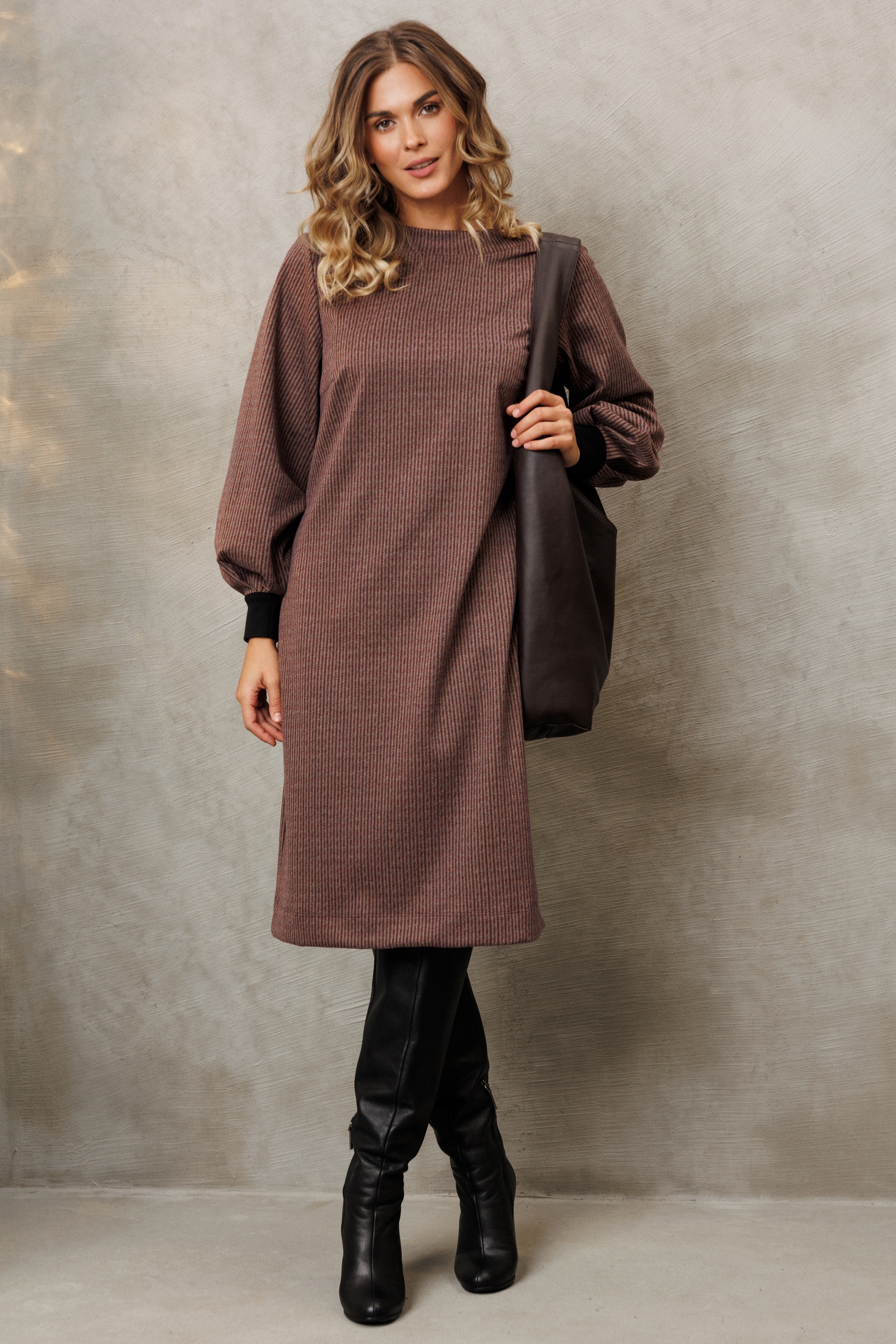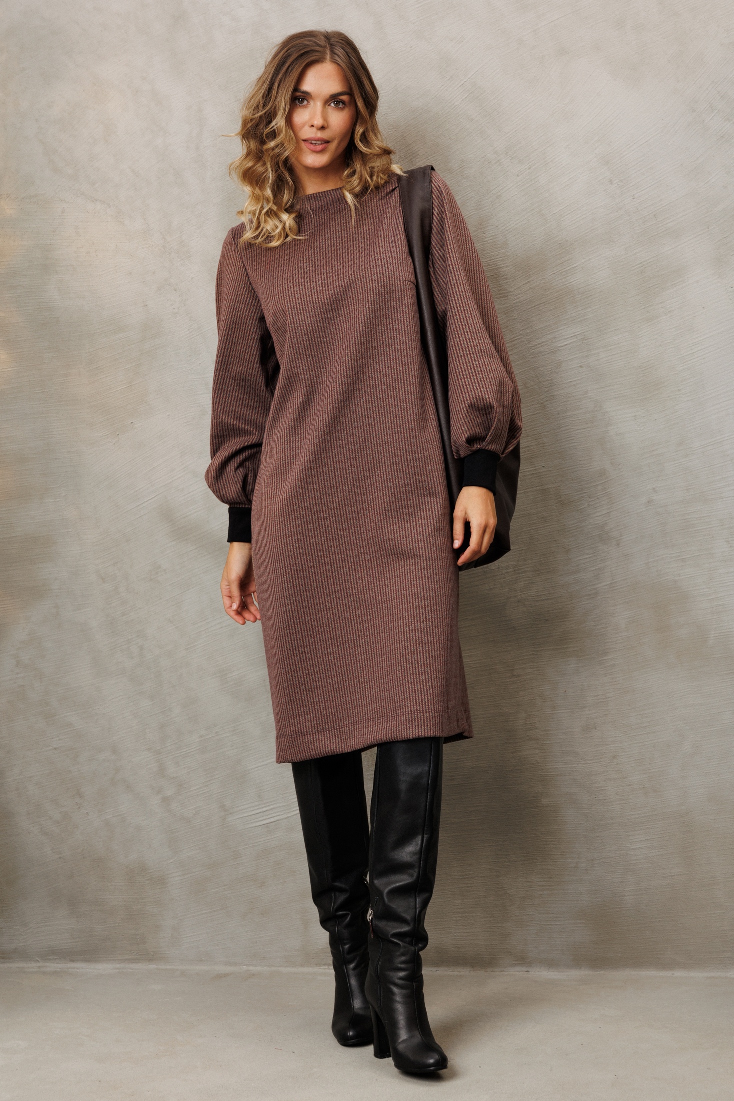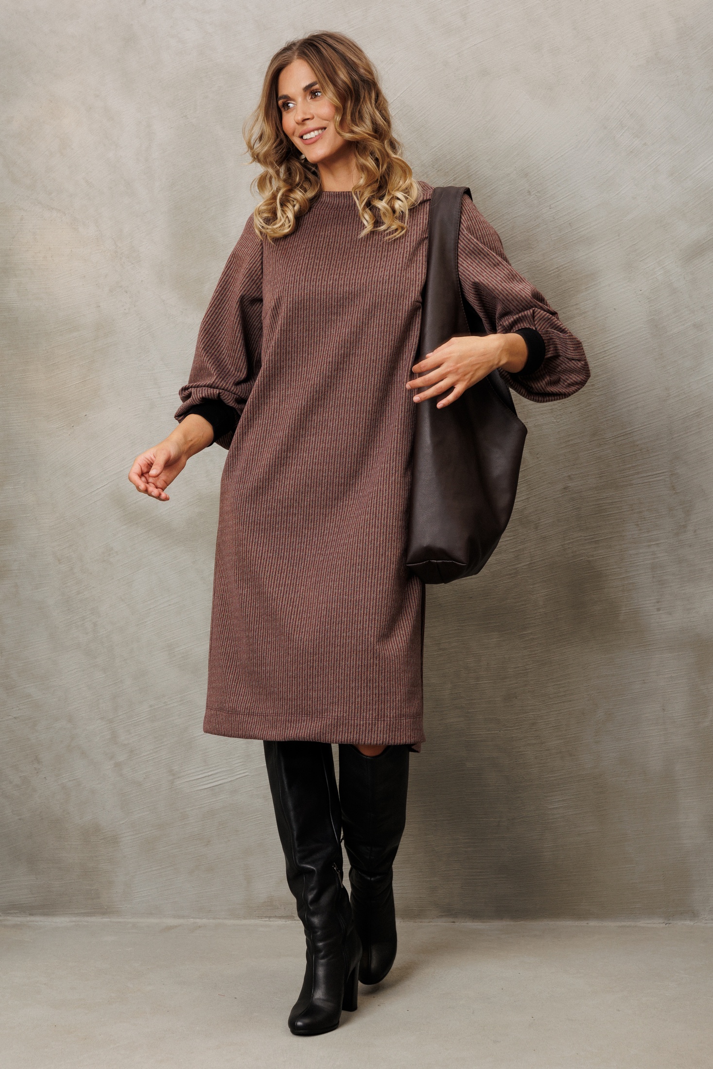 Платье прямого силуэта. Перед с нагрудными вытачками. Спинка со средним швом. Горловина лодочкой обработана планкой. Рукав одношовный втачной по низу со складками собранными на манжету-довяз. Длина платья-100см, длина рукава-60см.