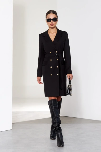 Платье прямого силуэта двубортное на четыре пары петель и пуговиц, с воротником пиджачного типа, с клапанами. Перед с рельефами и нагрудной вытачкой находящейся под лацканом. Спинка со средним швом, рельефами и шлицей. Рукав втачной двухшовный. Платье на подкладке. К платью прилагается пояс из основной ткани с металической пряжкой. Длина платья - 96 см, длина рукава - 61 см.