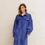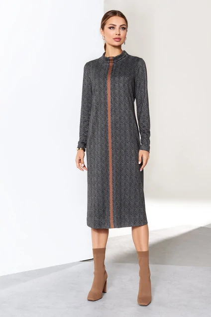 Платье полуприлегающего силуэта. Полочка с двумя нагрудными вытачками, по центру полочки настрочена красивая декоративная тесьма. Спинка цельнокроенная в верху обработан разрезик капелька. По горловине воротник в виде стойки застегивающейся на две петли и пуговицы. Рукав втачной одношовный. Длина платья-112 см, рукава-60 см.