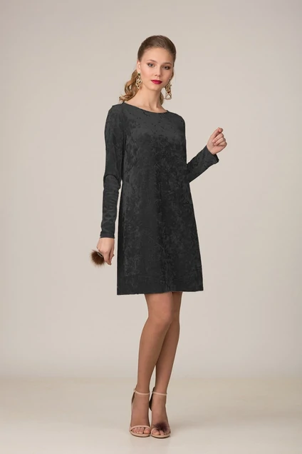 Платье свободного кроя из стрейчевой ткани «бархат» с нагрудной вытачкой по переду платья. Рукав узкий одношовный. Горловина-лодочка.