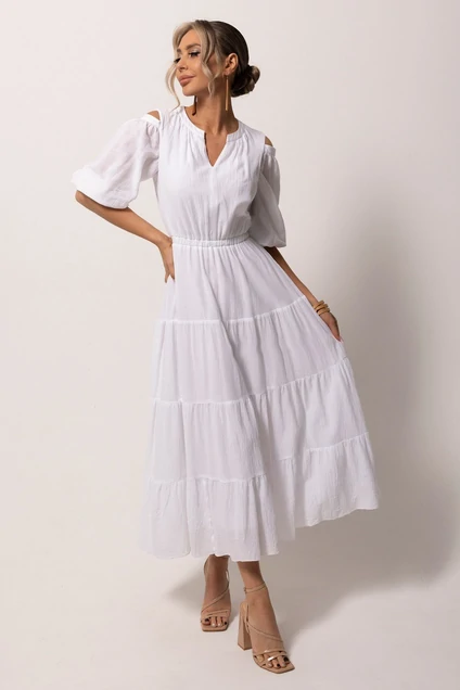 Платье, без застежки, с V-образным вырезом горловины, отрезной планкой горловины. Платье отрезное по линии талии, шов по талии присборен на резинку. Лиф переда со средним швом. Нижняя часть платья с воланами. Рукав втачной, 3/4, с открытым плечом , отрезной планкой по верху, манжетой, присборенной на резинку. Верх и низ рукава присборен.