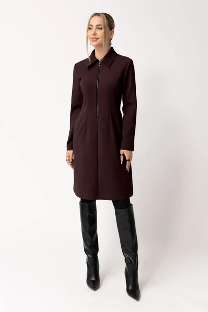 Платье полуприлегающего силуэта, с застежкой на декоративную молнию в среднем шве переда и на потайную молнию в левом боковом шве, с втачным воротником. По переду со средним швом и талиевыми вытачками. Спинка со средним швом, талиевыми вытачками. Рукав втачной, длинный. В боковых швах расположены карманы.
