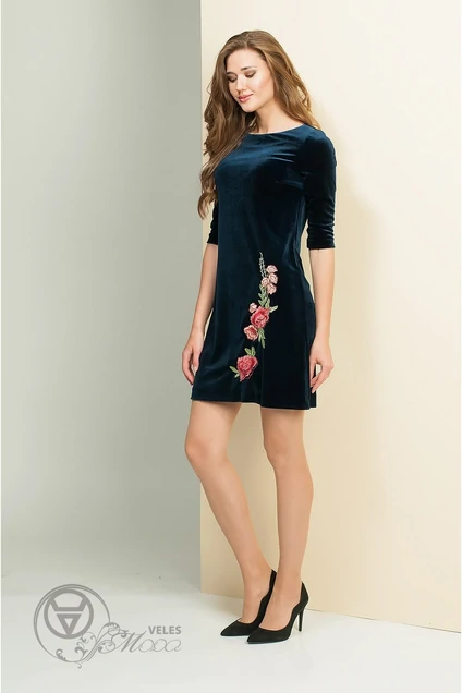 Классическое нарядное платье из велюра с декоративной вышивкой и круглым вырезом горловины. По переду с нагрудными вытачками. Спинка цельная. Силуэт: А - образный Вид покроя рукава: втачной, 3/4. Тип ткани: трикотажный, плательный, велюр Комплектация: платье на подкладке Длина изделия: 88,5 - 90,5см (соотв. размеру) Длина рукава: 36-38 см (соотв. размеру)