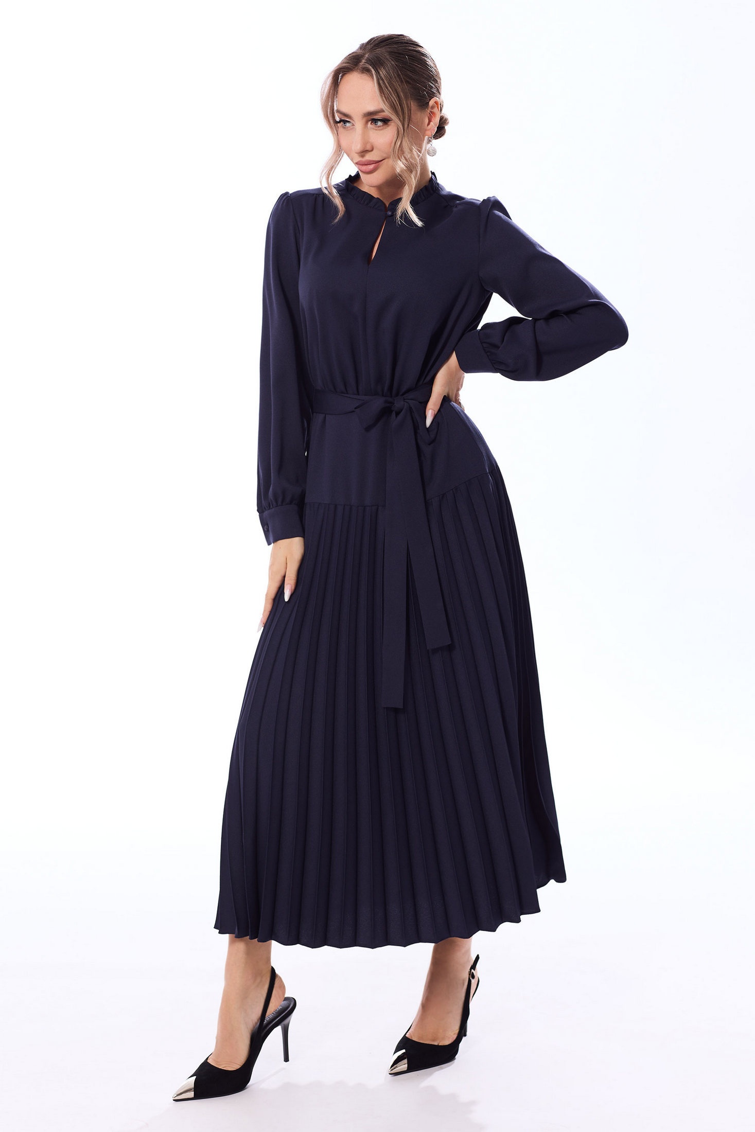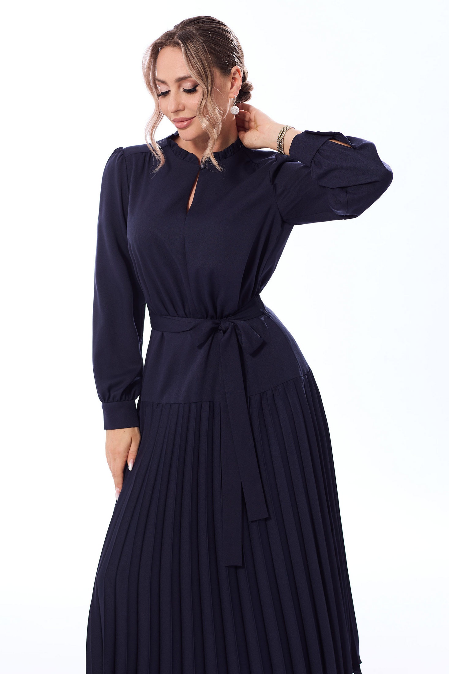 Платье с отрезным присборенным воротником- стойкой, горловина переда с разрезом, застегивающимся на одну навесную петлю и пуговицу. Платье отрезное по линии талии, шов по талии присборен. По низу платья- отрезная кокетка и деталь- гофре. Рукав втачной, длинный, с отрезной манжетой, застегивающейся на одну петлю и пуговицу. Платье со съемным поясом. На боковых швах расположены шлевки для пояса.