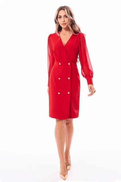 Платье без воротника, с V-образным вырезом горловины, центральной двубортной застежкой на петли и пуговицы по нижней части переда. Платье отрезное по линии талии. По лифу переда полочки с запахом, на уровне груди фиксируются пришивной кнопкой По шву притачивания к нижней части переда лиф переда и спинки присборен. Нижняя часть спинки с талиевыми вытачками. Рукав втачной, длинный, с отрезной манжетой, по шву притачивания манжеты присборен на резинку. Окат рукава присборен.