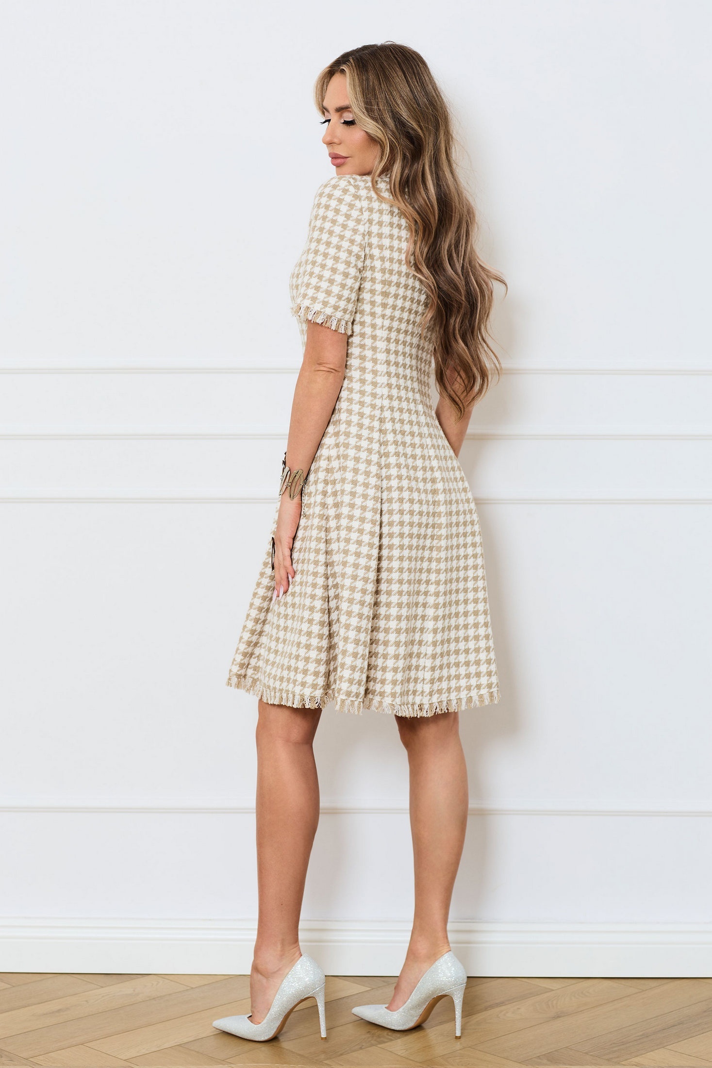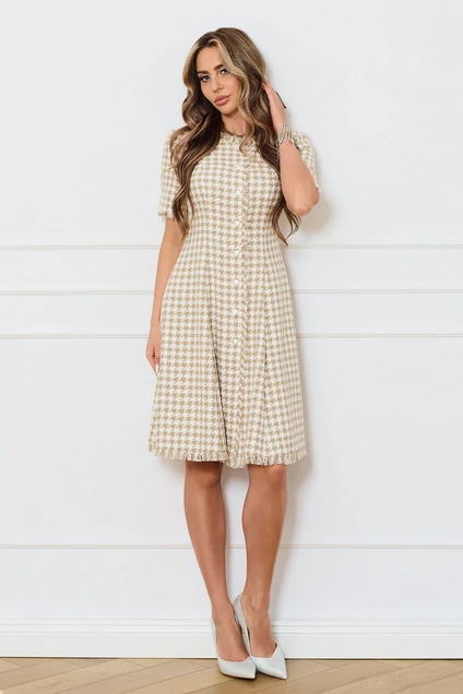 Платье 44284 бежевый Golden Valley привлекает внимание своим полуприлегающим силуэтом и элегантной бахромой. Коллекция бренда Golden Valley сочетает в себе комфорт и стиль, идеально подходящий для теплого сезона. Изготовленное из хлопка и полиэстера, это платье обеспечивает легкость и удобство в носке. Благодаря коротким втачным рукавам и центральной застежке на петли и пуговицы, оно подчеркивает женственность и стильность. Стильный бежевый цвет гармонирует с любым гардеробом, что делает его идеальным выбором как для офиса, так и для вечерних выходов. Геометрический рисунок добавляет оригинальности, а отделка в виде бахромы подчёркивает уникальность дизайна.