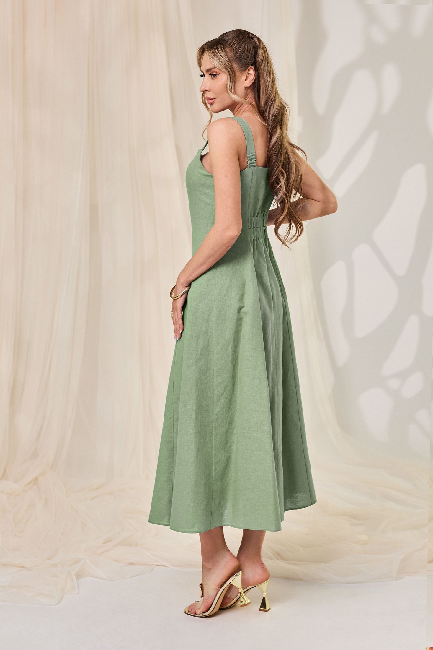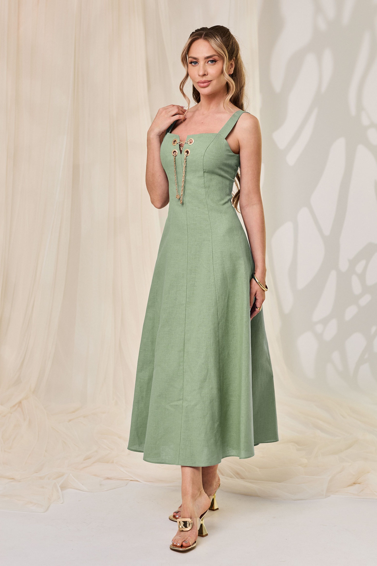 Платье 44301 зеленый Golden Valley — это идеальный выбор для вашего гардероба. Коллекция бренда Golden Valley предлагает это платье, выполненное из мягкого и дышащего 100% льна, что обеспечивает комфорт и свежесть в течение лета. Полуприлегающий силуэт и длина миди добавляют элегантности, а центральная застежка на потайную молнию удобна и практична. Декоративные люверсы с цепочкой и фигурный вырез горловины привносят изюминку в дизайн, делая его подходящим как для повседневной носки, так и для особых случаев. Универсальный зеленый цвет и стиль на бретелях без рукавов делают это платье незаменимым элементом вашего гардероба.