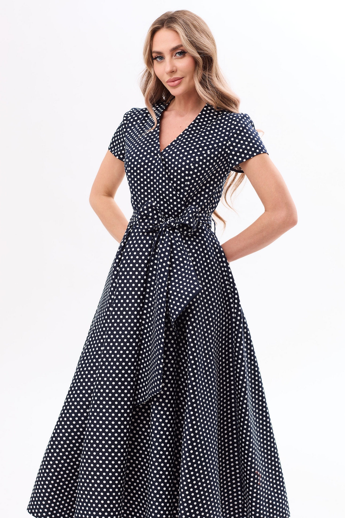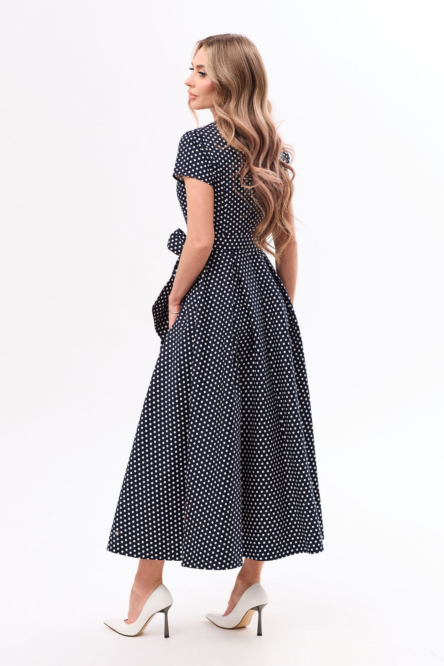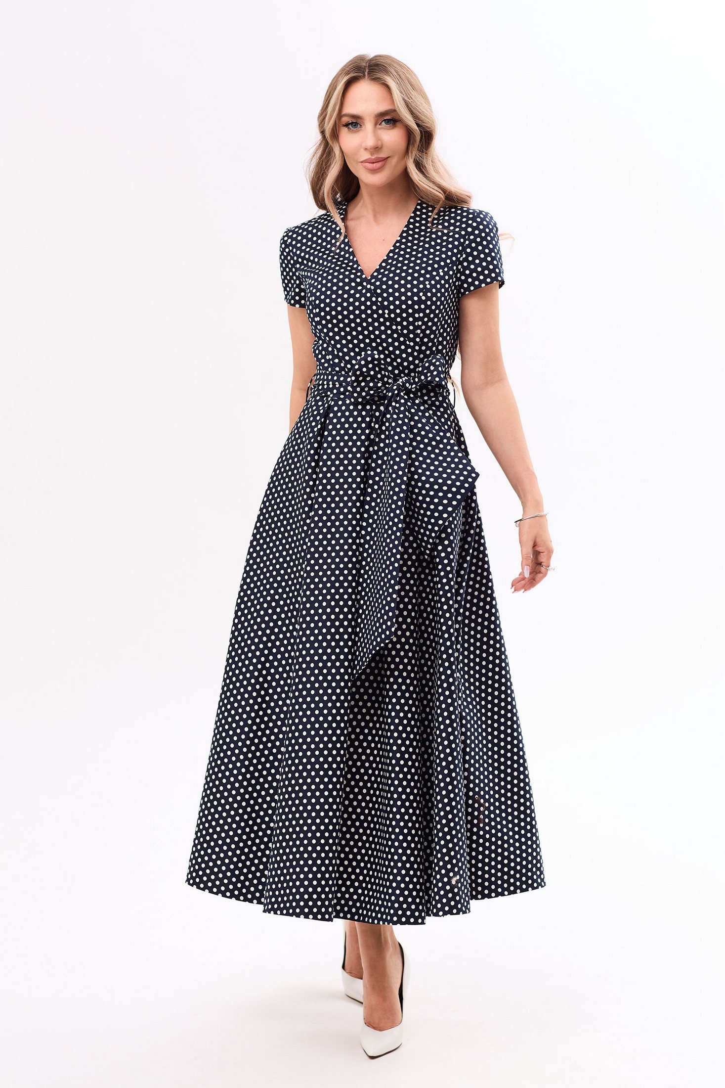 Платье с центральной застежкой на потайную молнию в среднем шве спинки, без воротника, с круглым вырезом горловины. Платье отрезное по линии талии. По шву подреза нижняя часть платья со встречными складками. Лиф переда с запахом, который фиксируется на уровне груди пришивной кнопкой. Верхняя часть спинки с рельефами, выходящими из проймы Рукав втачной, короткий. Платье со съемным поясом.