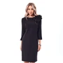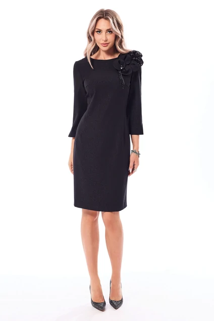 Платье без воротника, с фигурным вырезом горловины, застежкой на потайную молнию в среднем шве спинки. По переду с талиевыми и нагрудными вытачками. Спинка со средним швом, заканчивающимся шлицей, талиевыми вытачками. Рукав втачной, 3/4, со швом по верхнему срезу, заканчивающимся разрезом. Платье со съемной брошью. Силуэт: полуприлегающий. Вид покроя рукава: втачной. Цветовая гамма для верха, подкладки, фурнитуры, отделки: платье из ткани в одной цветовой гамме. Тип ткани: текстильный, плательный. Комплектация: платье на подкладке
