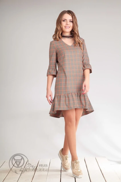Описание внешнего вида: платье с воротником - стойкой, V-образным вырезом горловины переда, застежкой на навесные петли и пуговицы по стойке спинки. По низу платья - волан. По переду с нагрудными вытачками. Спинка со средним швом. Силуэт: расширенный книзу Вид покроя рукава: втачной, 7/8. Цветовая гамма для верха, подкладки, фурнитуры, отделки: платье из эластичной ткани, с геометрическим рисунком. Стойка декорирована тесьмой. Тип ткани: текстильный, плательный, Комплектация: платье без подкладки Длина изделия: 93-94см (соотв. размеру) Длина рукава: 39-40,5см (соотв. размеру)