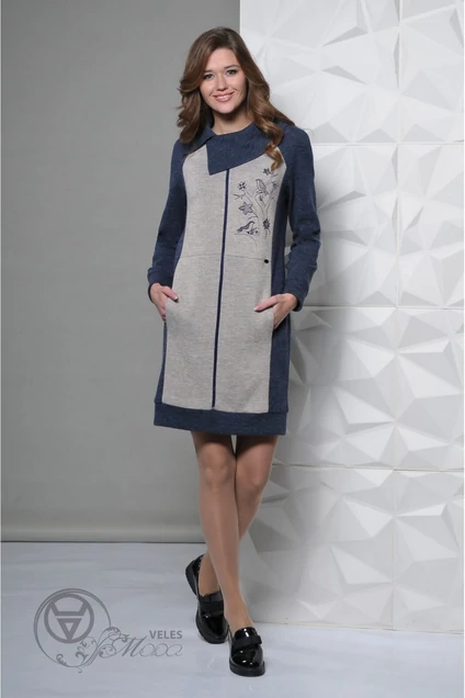 Оригинальное трикотажное платье с отложным асимметричным воротником. По переду с рельефами, выходящими из проймы. В рельефах расположены карманы. Центральная часть переда со средним швом, отрезная по линии талии. Центральные детали переда контрастны основной ткани. Средний шов переда декорирован тесьмой. Верхняя деталь переда декорирована вышивкой. Верхняя деталь переда с нагрудными вытачками. Спинка с рельефами, выходящими из проймы. Центральная часть спинки присборена по талии с помощью кулисы и шнура. По низу платья отрезная плланка. Силуэт: прямой Вид покроя рукава: реглан, длинный, с манжетой по низу рукава. Тип ткани: трикотажный, плательный, эластичный Комплектация: платье без подкладки