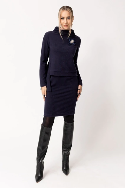 Платье с цельнокроеным воротником-стойкой, двуслойное. Верхняя часть платья отлетная. По переду отлетной детали нагрудные вытачки, по низу отлетной детали- отрезной пояс. Правый боковой шов отлетной детали с отрезными планками, разрезом по планке. Нижняя часть платья соединена с подкладкой. Длина изделия: 107-111 см (соотв. размеру)