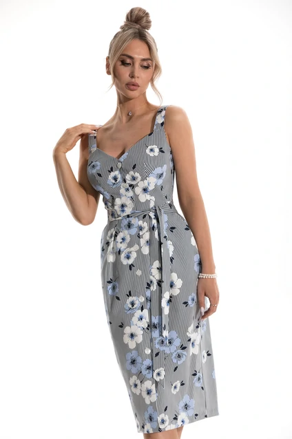 Платье с центральной застежкой на петли и пуговицы, на широких бретелях. Платье отрезное по линии талии. Верхняя часть переда с талиевыми вытачками, нижняя часть переда с карманами и односторонними складками по талии. Нижняя деталь спинки с талиевыми вытачками. Платье со съемным поясом.