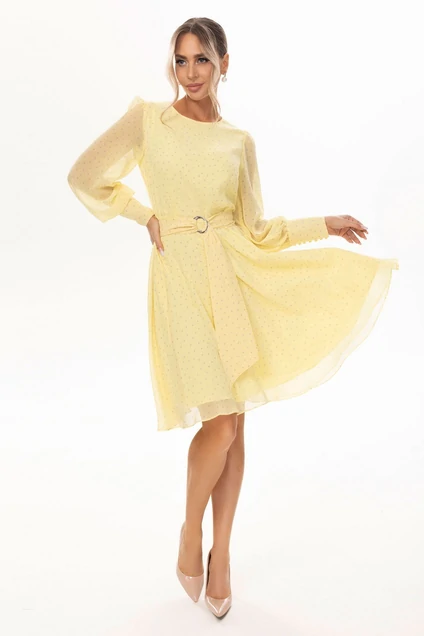 Платье без воротника, с круглым вырезом горловины, застежкой на потайную молнию в среднем шве спинки. Платье отрезное по линии талии. Верхняя часть переда с талиевыми вытачками. Спинка со средним швом, верхняя часть спинки с талиевыми вытачками. Окат рукава присборен. Платье со съемным поясом.
