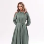 Платье без воротника, с круглым вырезом горловины, центральной застежкой на кнопки на отрезной планке. Перед с кокеткой, накладным карманом по верхней части переда. Спинка со средним швом, кокеткой. Из шва притачивания планки выходит пояс, фиксированный кнопками по спинке. Рукав втачной, длинный, с отрезной манжетой, двухшовный. В боковых швах расположены карманы.