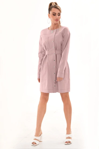 Платье без воротника, с круглым вырезом горловины, центральной застежкой на кнопки на отрезной планке. Перед с кокеткой, накладным карманом по верхней части переда. Спинка со средним швом, кокеткой. Из шва притачивания планки выходит пояс, фиксированный кнопками по спинке. Рукав втачной, длинный, с отрезной манжетой, двухшовный. В боковых швах расположены карманы.