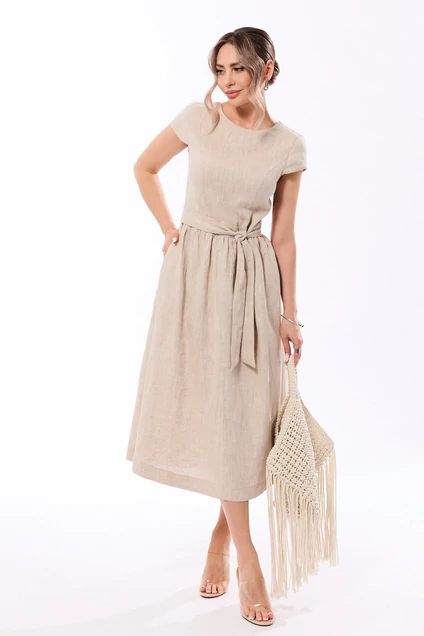 Платье полуприлегающего силуэта, с круглым вырезом горловины, без воротника, застежкой на петли и пуговицы по спинке. Платье отрезное по линии талии, с втачным поясом. Верхняя часть переда с рельефами, выходящими из проймы. Верхняя часть спинки с талиевыми вытачками, фигурным вырезом горловины и фигурным вырезом по низу, застежкой на две петли и пуговицы. Нижняя часть платья со сборкой по шву притачивания к поясу. Рукав втачной, короткий, крылышко. В боковых швах расположены карманы.
