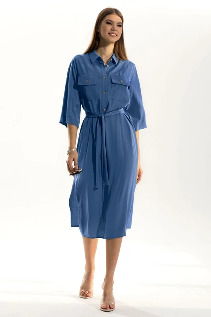 Платье с втачным воротником с отрезной стойкой, центральной застежкой на в петли и пуговицы. По переду втачная планка, накладные карманы с клапанами. Накладные карманы со встречной складкой. Спинка с отрезной кокеткой, встречной складкой по шву притачивания кокетки. На стойке со стороны спинки закреплена шлевка для закрепления декоративного шарфа. Плечевые швы, переходящие на перед. Рукав втачной, 3/4.