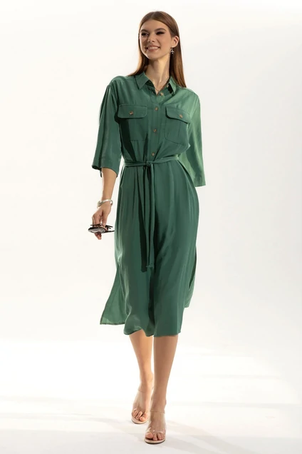 Платье с втачным воротником с отрезной стойкой, центральной застежкой на в петли и пуговицы. По переду втачная планка, накладные карманы с клапанами. Накладные карманы со встречной складкой. Спинка с отрезной кокеткой, встречной складкой по шву притачивания кокетки. На стойке со стороны спинки закреплена шлевка для закрепления декоративного шарфа. Плечевые швы, переходящие на перед. Рукав втачной, 3/4.