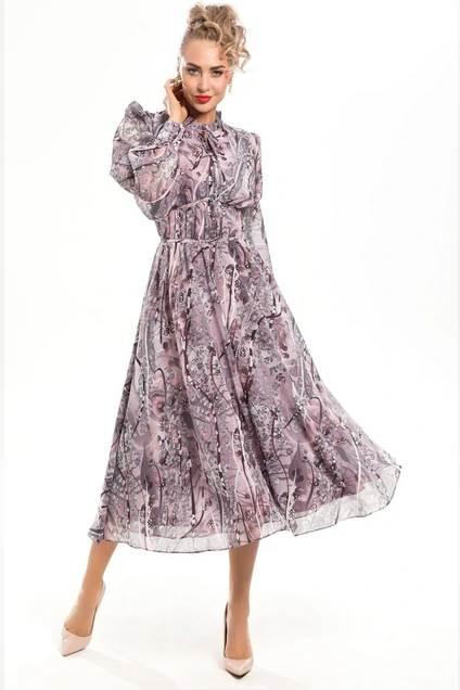 Платье, с застежкой на потайную молнию в левом боковом шве. По горловине- рюша с завязками. По линии талии- втачной фигурный пояс с подрезными планками. По плечевым швам и швам притачивания пояса- сборка. Рельефные швы пояса переда и спинки усилены регилином. Рукав втачной, длинный, с отрезной манжетой. По окату и шву притачивания манжеты- сборка.