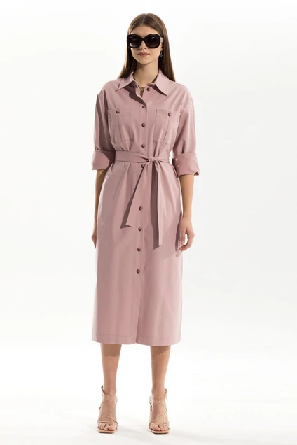 Платье с центральной застежкой на петли и пуговицы, с втачным воротником с отрезной стойкой. По полочкам на уровне груди расположены накладные карманы. Спинка цельная. В боковых швах расположены карманы. Рукав длинный, с отрезной манжетой. Платье со съемным поясом.