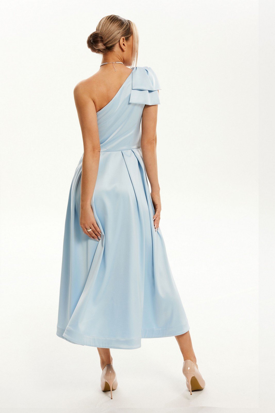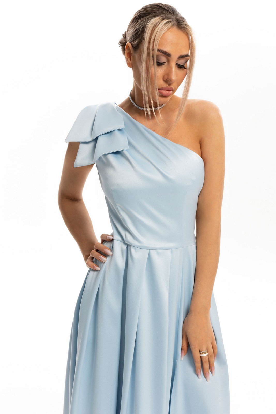 Платье без воротника, с застежкой на потайную молнию в левом боковом шве. Платье отрезное по линии талии. Лиф переда и спинки асимметричный, с драпировкой на левом плече, талиевыми вытачками. Нижняя часть переда и спинки платья с односторонними складками. По нижней части платья с рельефным швом, заканчивающимся разрезом. В боковых швах расположены карманы. На левом плече расположен декоративный бант.