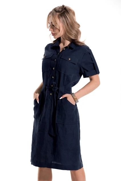 Платье с центральной застежкой на петли и пуговицы, втачным воротником с отрезной стойкой. По переду- накладные карманы с клапанами расположенные на уровне груди. Накладные карманы с цельнокроенной патой расположены на уровне бедер. Спинка со средним швом. Пата рукава переходящая в погон по плечевым швам. Платье со съемным поясом.