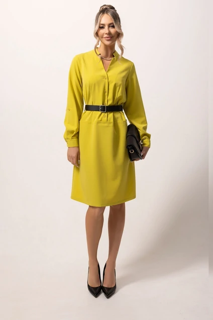 Платье с отрезным воротником-стойкой, с центральной застежкой на петли и пуговицы, с V-образным вырезом горловины. Платье отрезное по линии бедер. Верхняя часть переда с талиевыми вытачками. Верхняя часть спинки со средним швом, талиевыми вытачками. Нижняя часть платья со складкой по шву притачивания к верхней части. В боковых швах расположены карманы. Рукав втачной, длинный. Платье со съемным поясом. По боковым швам расположены шлевки для пояса.