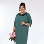 Нарядное элегантное платье женское, прилегающего силуэта, с нагрудными вытачками, идущими от центра груди к боковым швам. С левой стороны переда, на груди, расположен декоративный цветок из отделочной ткани молочного цвета. По горловине платья идет бейка из отделочной молочной ткани в тон цветка.