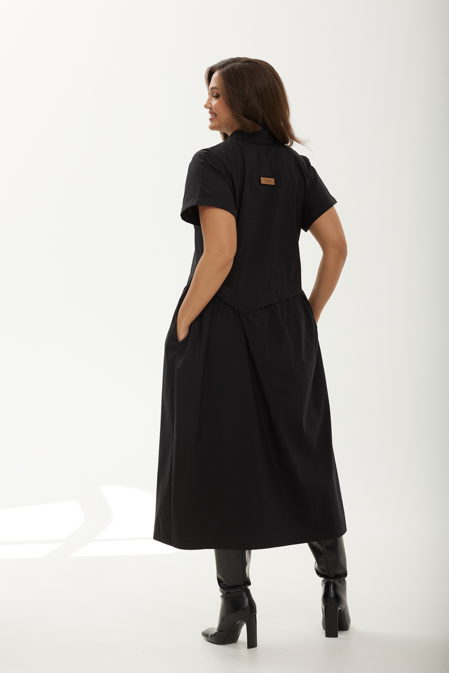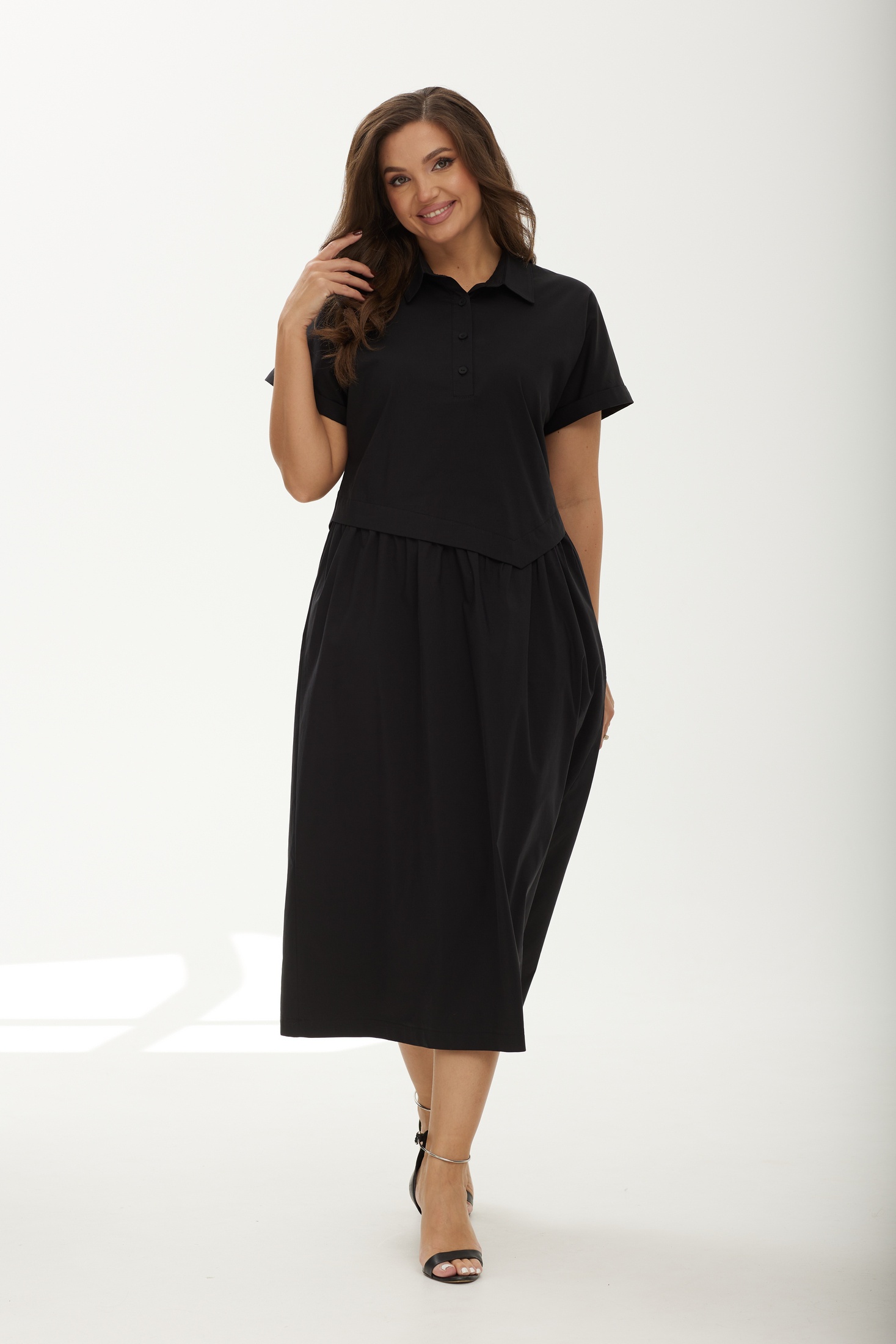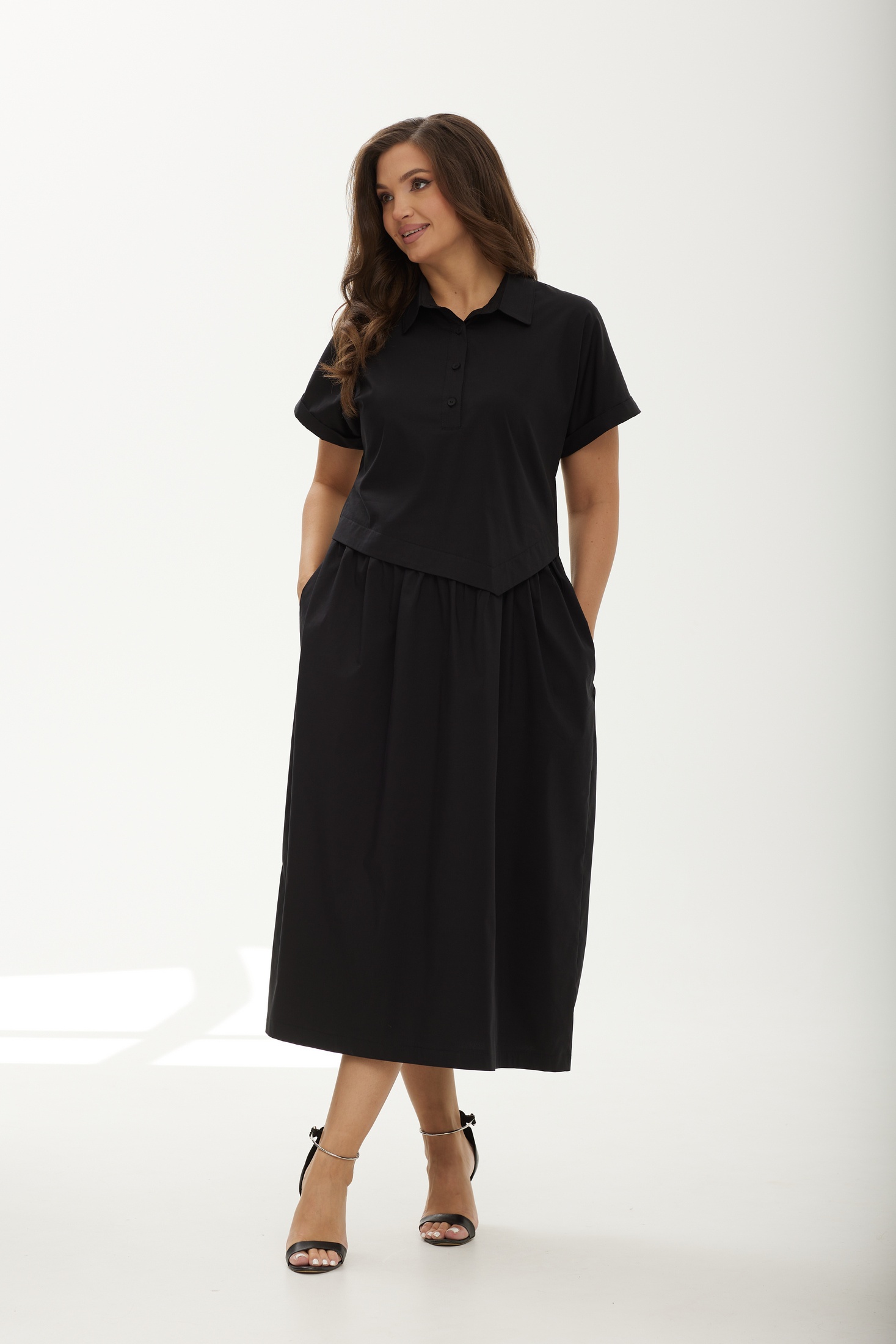 Платье 25ICY087Ч черный ICY Street — это идеальное сочетание комфорта и стиля. Коллекция бренда ICY Street предлагает легкий и воздушный А-образный оверсайз-силуэт, выполненный из плательной ткани со стрейчем, которая мягко повторяет изгибы тела. Дизайнерский элемент в виде асимметричного отлетного подреза добавляет динамики, а спущенная линия плеча и цельнокроёный рукав с манжетой обеспечивают свободу движений. Практичное решение — карманы в боковых швах — делает это платье идеальным для повседневной носки. Черный цвет и рубашечный воротник на стойке дополняют образ, создавая стиль бохо для любого летнего или весеннего дня.