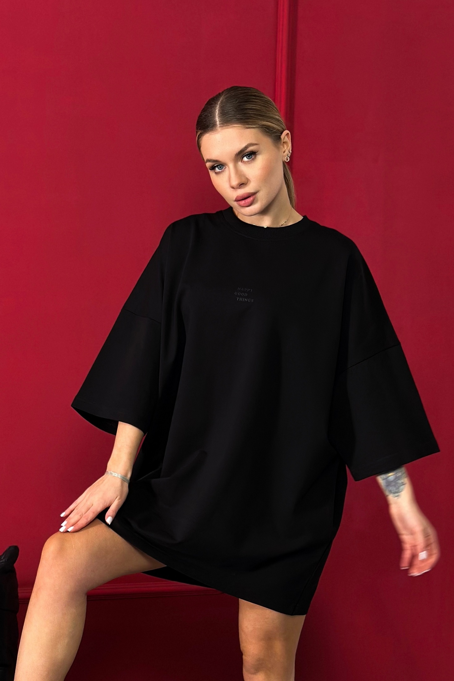 Платье 25ICY101 чёрный ICY Street — это модная модель в стиле oversize, выполненная из мягкого трикотажа 2х нитка. Коллекция бренда ICY Street предлагает комфорт и эластичность благодаря натуральному хлопку с добавлением эластана. У модели расслабленная посадка, спущенная линия плеча и углублённая пройма делают её объёмной и уютной. Особый акцент — декоративная наклейка по центру груди. Платье отлично подходит для повседневной носки в осенне-весенний сезон. Цвет изделия — чёрный, что добавляет универсальности и лёгкости в сочетании с другими предметами гардероба. Длина изделия составляет 86 см.