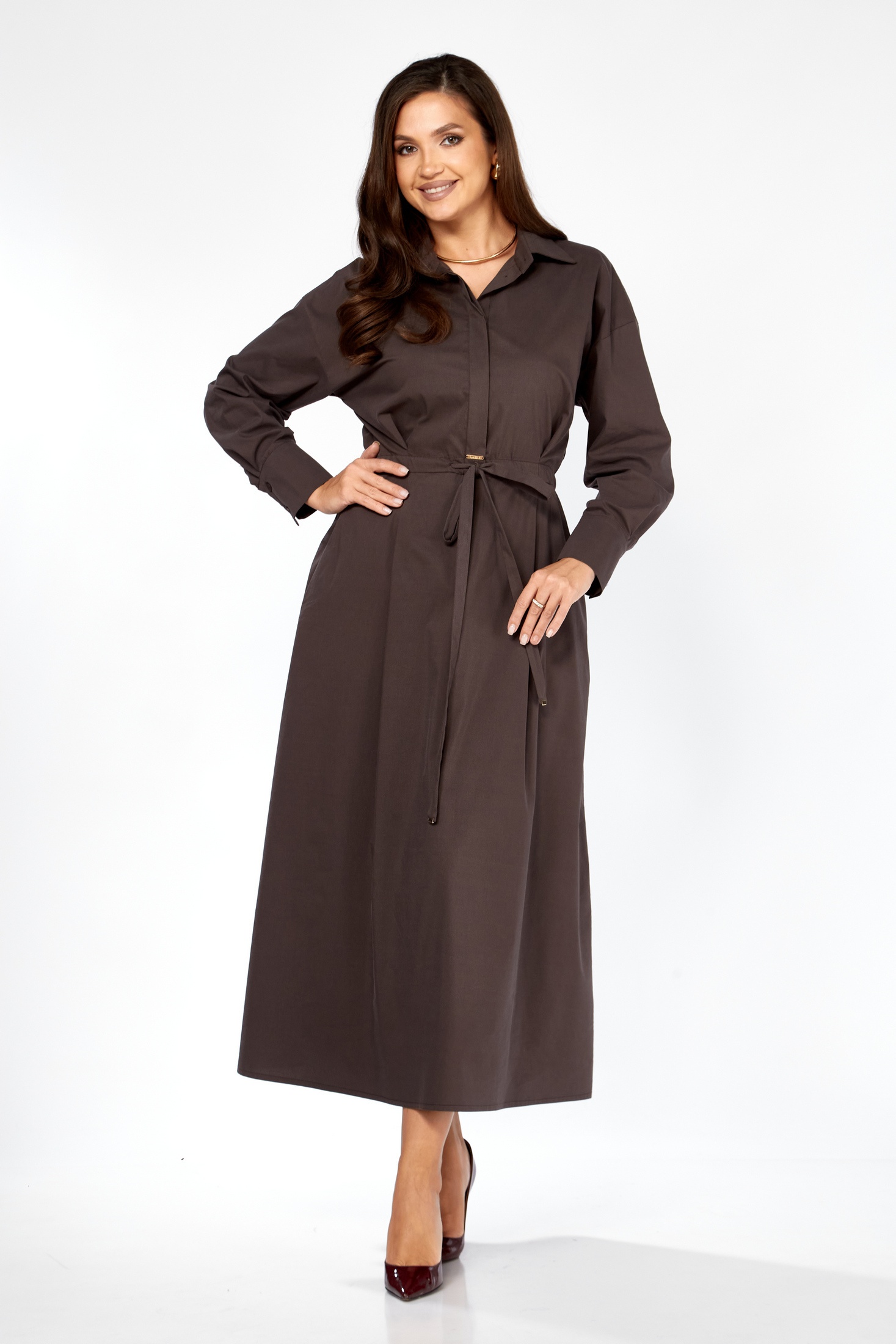 Платье 25ICY115Ш-3 шоколад ICY Street — это стильное макси-платье, идеально подходящее для тех, кто ценит комфорт и актуальный стиль. Коллекция бренда ICY выполнена из мягкого хлопка с добавлением полиамида и эластана, что обеспечивает приятное прилегание и свободу движений. Прямой силуэт с расширенной линией низа создает современный образ, а отрезная талия с кулисой и завязывающимся поясом добавляет изящества. Спущенные рукава длиной до манжет снабжены пуговицами для дополнительного удобства. Воротник-стойка и потайная застёжка до талии подчеркивают деловой стиль, а карманы в боковых швах делают платье практичным. Шоколадный цвет добавляет глубины, что делает его отличным выбором для офисного или повседневного выхода в любое время года.