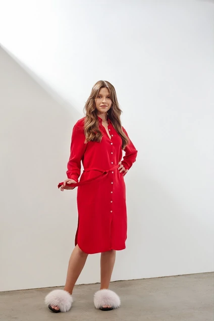 Платье-рубашка прямого силуэта под пояс с разрезами по бокам. Спущенная линия плеча, длинные рукава с манжетами. Отложной воротник рубашечного покроя, застежка на пуговицах.
