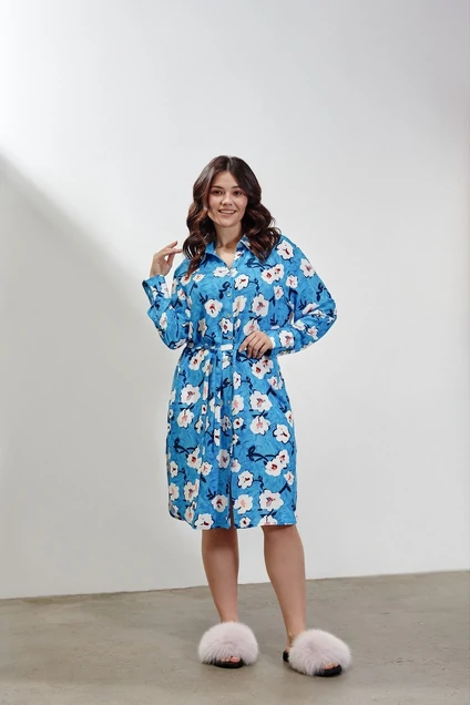 Платье-рубашка прямого силуэта под пояс с разрезами по бокам. Спущенная линия плеча, длинные рукава с манжетами. Отложной воротник рубашечного покроя, застежка на пуговицах.