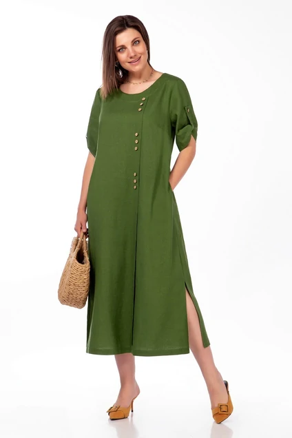 Платье женское свободного, расширяющегося к низу силуэта, выполненное из натуральной льняной ткани. Горловина- округлая, сзади с застежкой "капля" на навесную петлю и пуговицу. Перед платья с нагрудными вытачками и декоративной планкой смещенной от центра, на которой нашиты пуговицы из натуральной материала (кокос). Рукав втачной с патой, для регулировки длины. Спинка с центральным швом. В боковых швах - карманы и по низу - разрезы. Ширина плеча - 9см, длина рукава - 31см, длина изделия - 124см