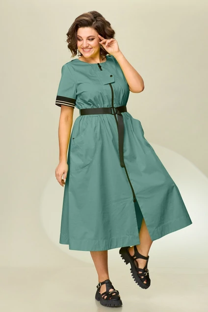 Платье женское полуприлегающего силуэта. Вырез горловины округлый, рукав втачной по низу манжеты из декоративной тесьмы-резинки. По талии платье на резинке, по полочке накладные функциональные карманы. По спинке кокетка, по плечевым швам паты на кнопке (нефункциональные). Изделие на застежке по переду на тесьму-молнию. Длина рукава – 26см, ширина плеча – 10см. Длина изделия 122см