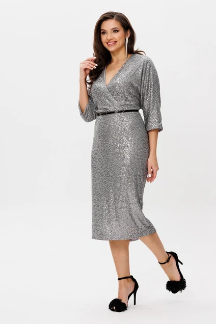 Платье полуприлегающего силуэта, горловина на запах V-образная, рукав цельнокроенный ¾-х. По переду подрез по линии талии. Изделие без застежки. В комплекте – ремень. Платье на трикотажной подкладке.