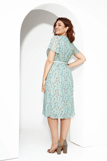 Элегантное платье А-силуэта мятного цвета, украшенное нежным цветочным принтом в тёплых оттенках. Изготовлено из легкой струящейся ткани, с трикотажной подкладкой для комфорта. Дизайн дополняют аккуратные рельефы на передней и задней части, придающие изделию изысканный вид. Втачные короткие рукава добавляют изящества. Платье снабжено съемным поясом, позволяющим подчеркнуть талию. Идеальный выбор для дневных и вечерних мероприятий.