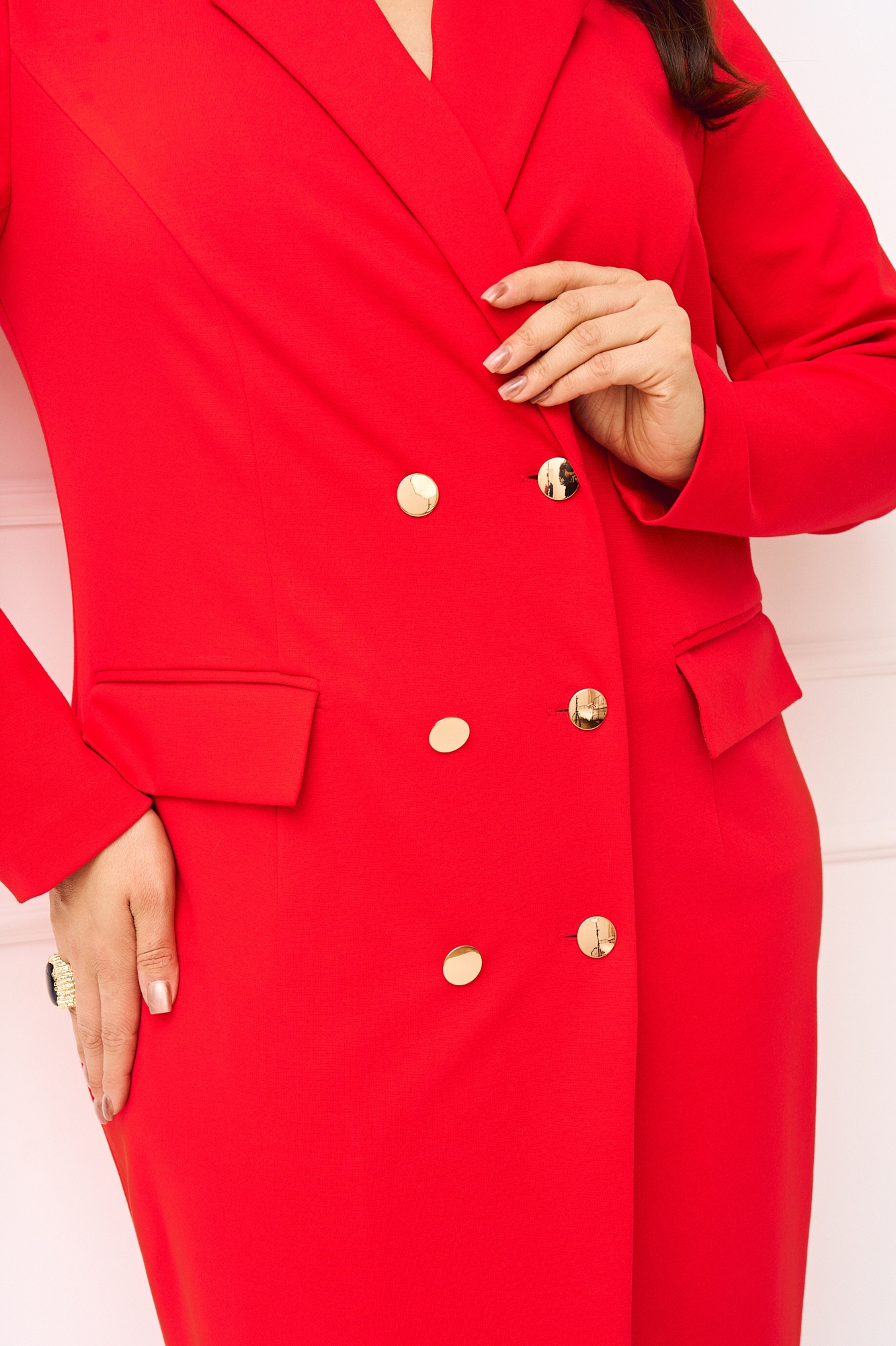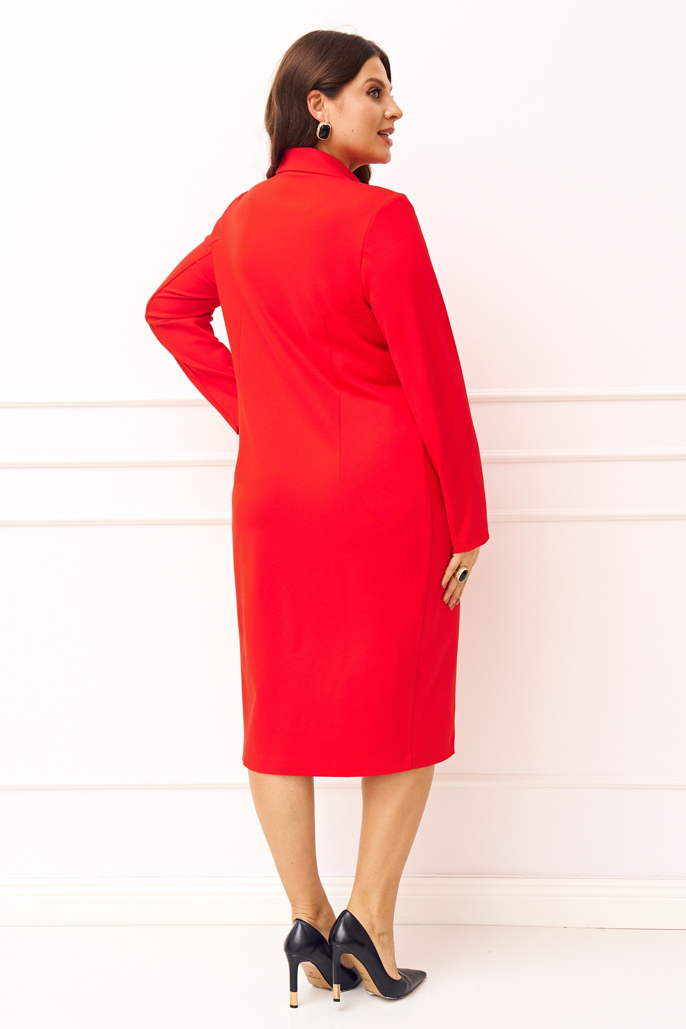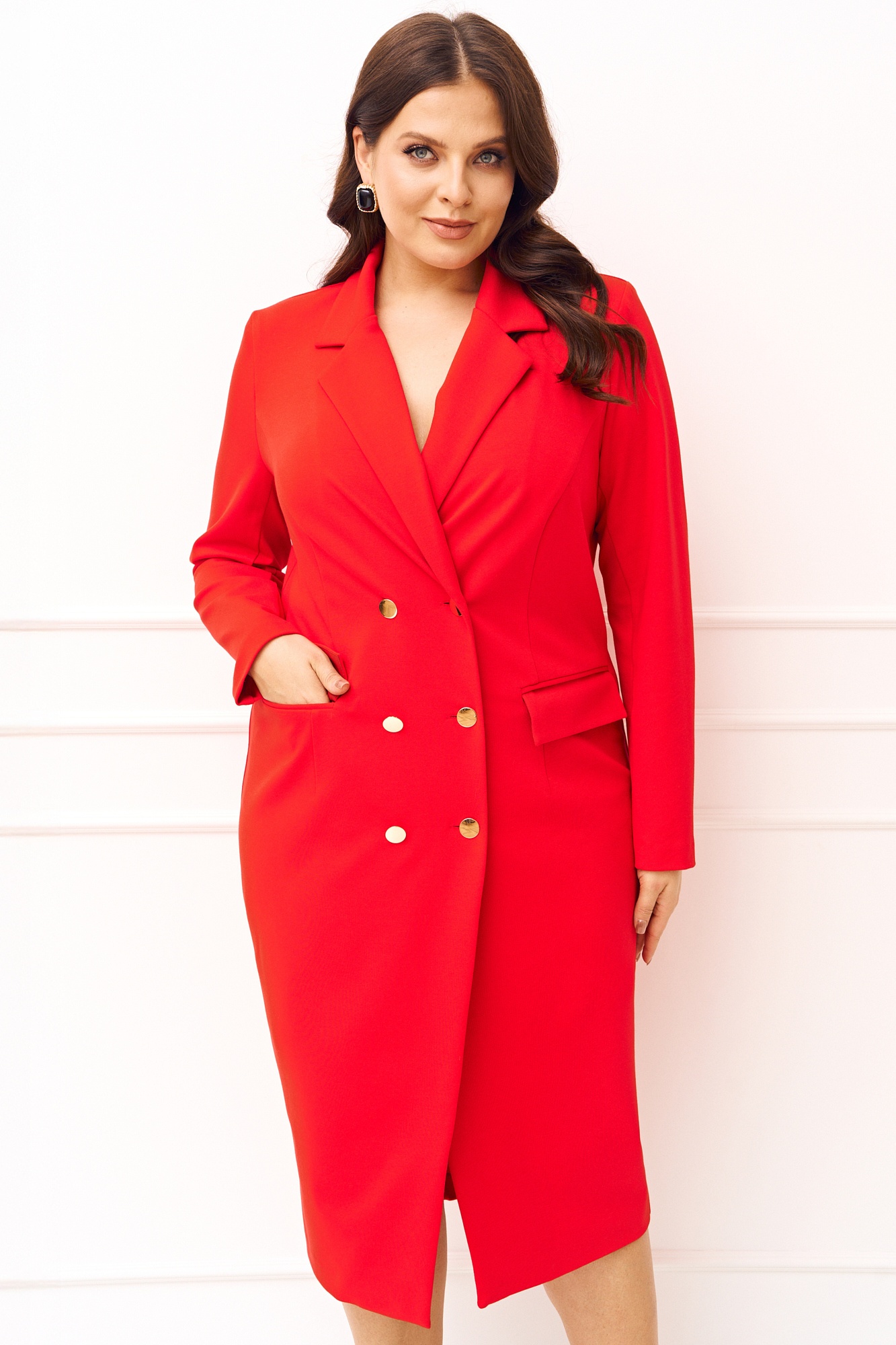 Элегантное красное платье-халат станет изысканным дополнением к вашему гардеробу. Изготовлено из качественного трикотажного полотна средней плотности, это платье обеспечивает идеальное сочетание стиля и комфорта. Модель полуприлегающего силуэта эффектно подчеркнет силуэт, сохраняя при этом удобство в течение всего дня. Дизайн платья включает воротник с лацканами и двубортную застежку с элегантными пуговицами, добавляющими акцент на передней части. Втачные рукава добавляют аккуратности общему виду, а функциональные прорезные карманы на передней части платья удобны для носки мелких предметов.
