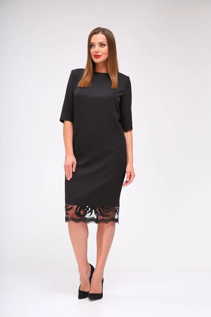 Платье женское прямого силуэта. Горловина округлая, вытачки от плечевого шва. Спинка с V - образным вырезом и планками вдоль среднего шва, по верхней части среднего шва выполнена потайная молния, по низу разрез. Низ оформлен кружевом. Рукав втачной длиной до локтя. Длина платья - 95 см, ширина по линии груди - 51,5/53,5/55,5, ширина по линии бедер - 53/55/57, длина рукава - 36 см, ширина рукава - 17/18/19.