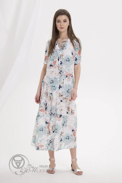 Легкое платье А-образного силуэта, длиной миди с цветочным принтом, украсит не только вас, но и любой день, также отлично подойдет и для вечерних теплых прогулок. Спинка платья отрезная ниже линии талии, с притачным поясом. По лифу спинки средний шов и талиевые вытачки. К поясу притачаны воланы присборены на сборку. Перед платья с центральным швом, с нагрудными вытачками, с ассиметричными косыми подрезами, по которым притачаны воланы со сборкой. Горловина V-образной формы, по шву обтачивания вставлены петельки и протянут шнурок из основной ткани. Рукава выше локтя, втачные, одношовные. Платье дополняют шнурки из основной ткани, которые продеты в петельки по шву притачивания волана по переду. Длина платья – 126,0см Длина рукава – 27,0см