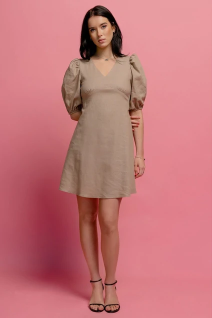 Платье молодежное женское полуприлегающего силуэта из натуральной ткани лен ,с обьемным рукавом длиной до локтя,с подкладкой по нижней части.Перед с фигурным вырезом ниже линии груди со сбокой по лифу.По спинке фигурный вырез и по юбке функциональный шнурок.Изделие с расширением к линии низа.Рукав с активной сборкой по окату.По низу рукава ,складка и сборка на эластичную тесьму.Горловина V-образной формы по переду.