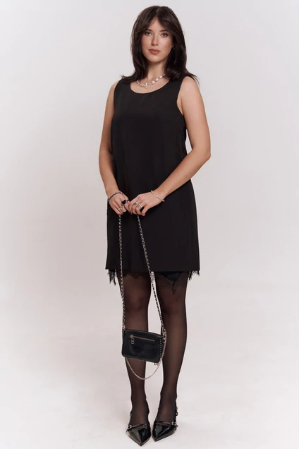 Платье молодежное слегка О образного силуэта без рукавов на подкладке ,с застежкой молнией в левом боковом шве и декором длинный шарф из шифона контрастного цвета.Перед с рельефами переходящими в карманы ниже линии талии.Вырез по переду U-образный.В комплекте идет подьюбник( отдельно)с фигурным низом из шелка Армани и кружевом