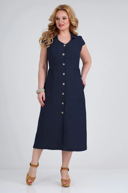 Платье женское А-силуэта, изготовлено из натурального льна белорусского производства. Горловина V-образной формы, оформлена отложным воротником. Застежка центральная на петли и пуговицы. Перед разрезной по линии талии. В верхней части обработаны рельефы, нижняя часть с небольшой сборкой и накладными карманами. Спинка со средним швом и кокеткой. Рукав втачной короткий. Все конструктивные швы отстрочены отделочной ниткой.